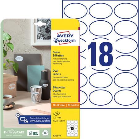 Etikett, univerzális, 63,5x42,3 mm, ovális, AVERY ZWECKOFRM, 180 etikett/csomag